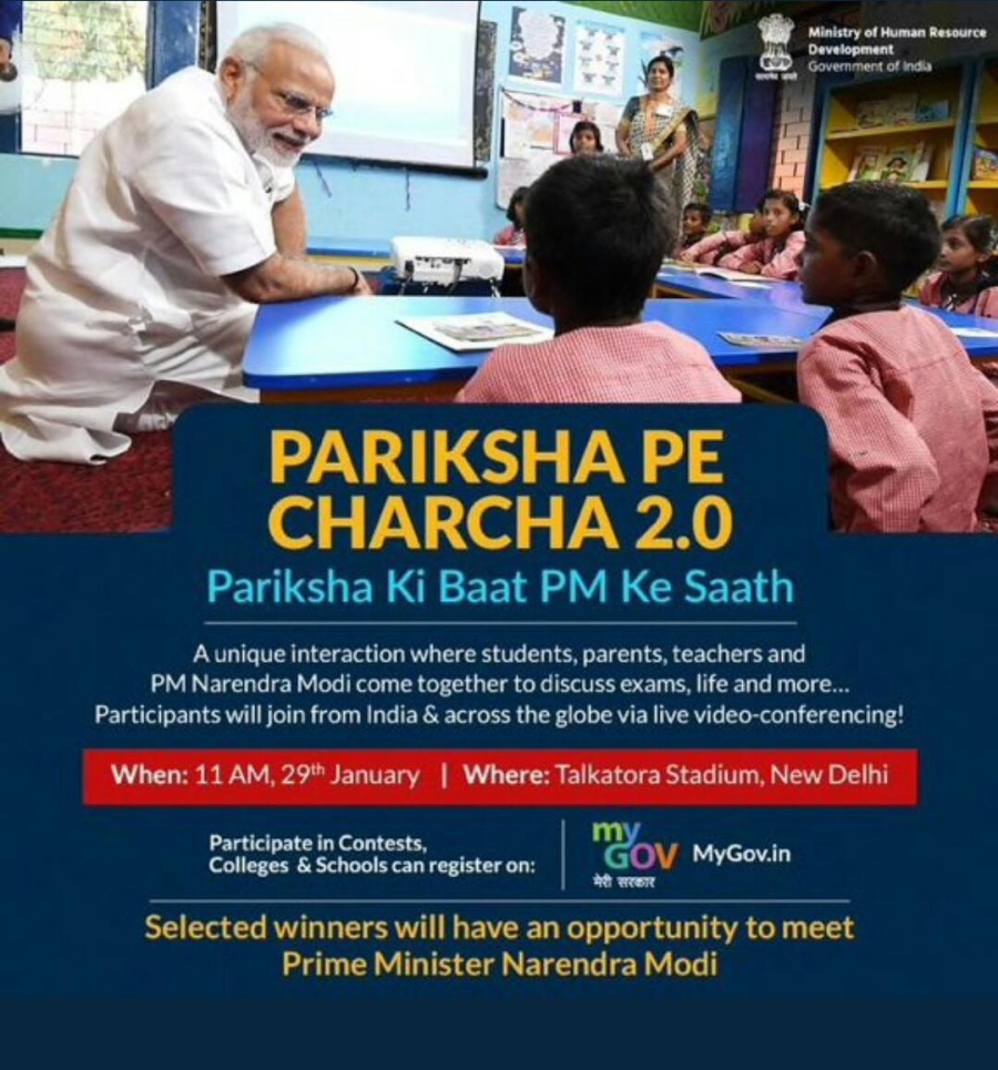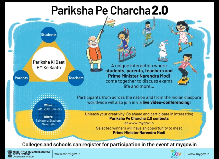 With class X and class XII examinations round the corner, Hon'ble Prime Minister will once again interact with a cross-section of school Students, Teachers and Parents on 29th January 2019 with his initiative 'Pariksha Par Charcha 2.0' An online competition has also been under progress from January 7, 2019 and will continue to go on till January 17, 2019 for the students of classes 9th to 12th , their parents and teachers on the following themes. Students, their teachers and parents can participate in these competitions through www.mygov.in website.