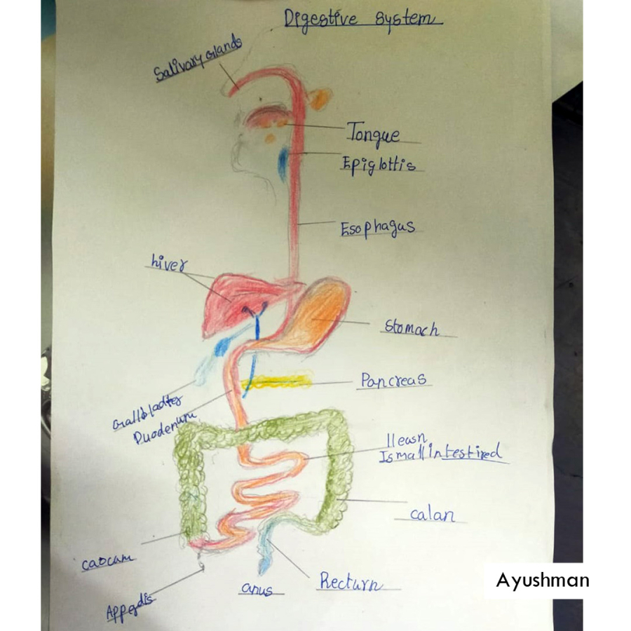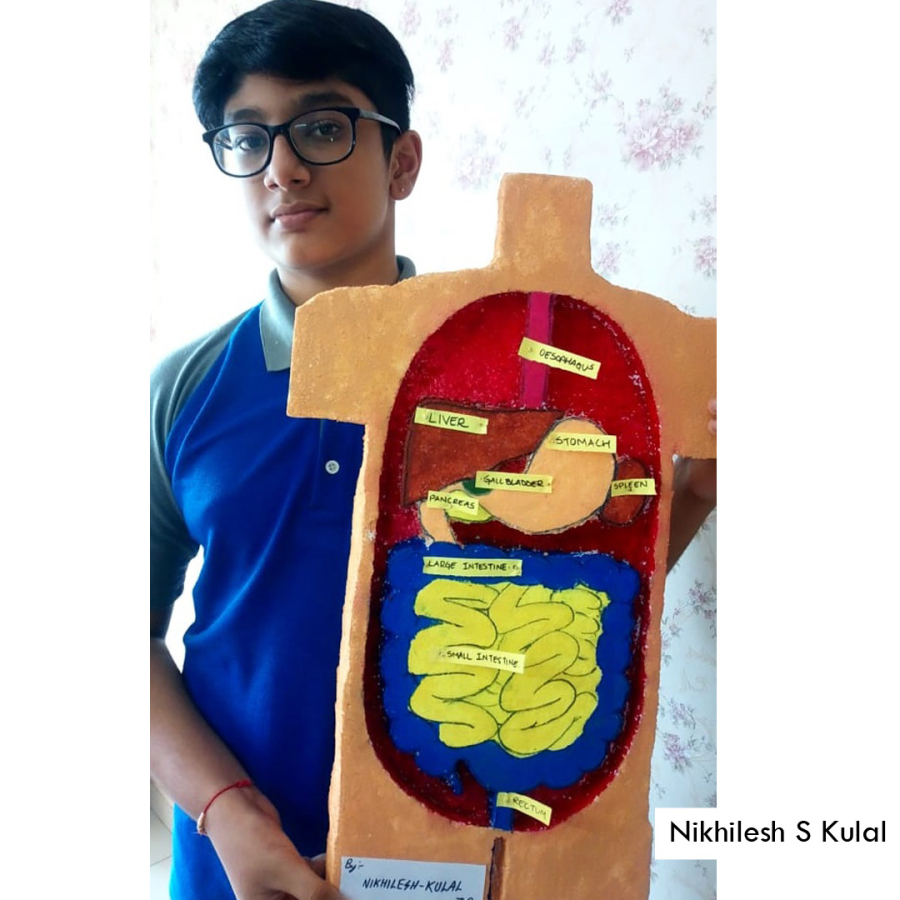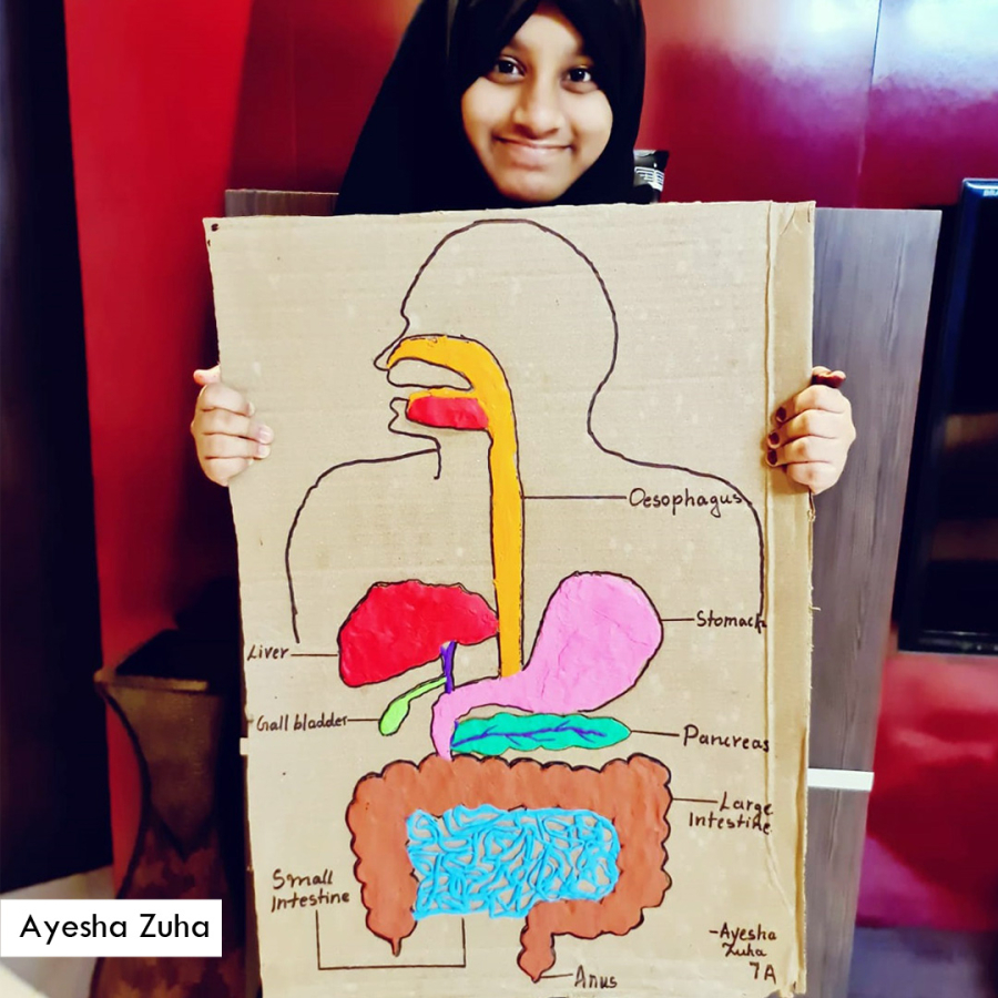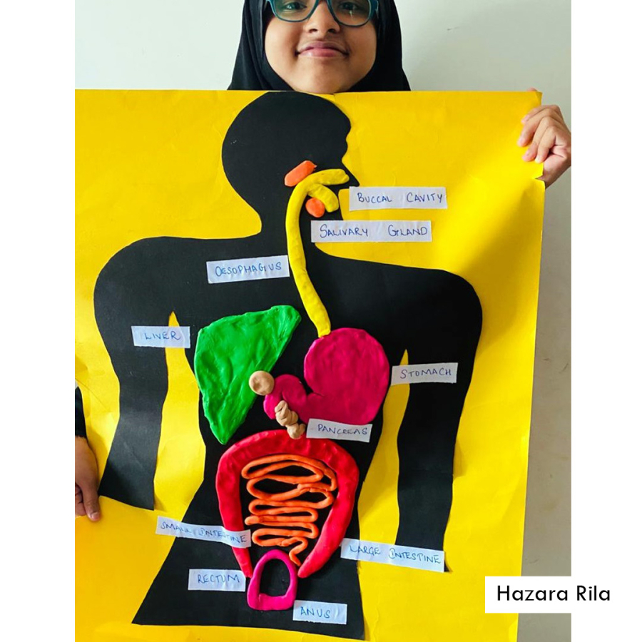 As part of the science curriculum students were asked to make a model of the Human digestive system by using any sort of materials available at home, in order to encourage the children get physically and mentally involved in the learning process and to retain the information.