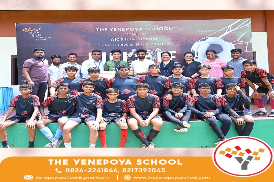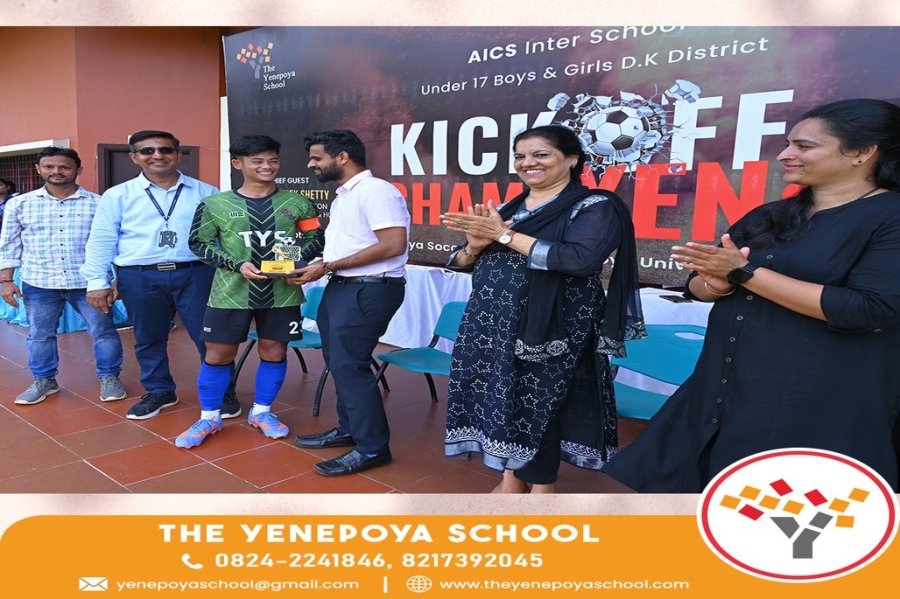 The Yenepoya School organized AICS Football Tournament – Kick Off ChampYENs at Yenepoya Soccer Ground at Yenepoya University, and Fr. Muller Homeopathic Hospital Ground, Mangalore, on 25th and 26th September 2023. The event witnessed a huge participation of over 500 players from 32 teams from Dakshina Kannada district. Boys and girls in the under 17 category were involved in the competition. Dr. Abhishek Shetty, Associate Professor, Department of Orthopedics, YMCH, was the Chief Guest. Principal of The Yenepoya School & PU College, Mr. Uzwal Menezes, staff, parents, the participating teams and their mentors were present for the inaugural ceremony that took place at Yenepoya Soccer ground. The programme began with a prayer that was followed by the recitation of the school anthem. Principal, Mr. Uzwal Menezes welcomed the gathering. The dignitaries were introduced to the participating teams and the Chief Guest declared the tournament open with the kick off. The tournament flagged off with the inaugural match between the girls teams of Carmel School, Mangalore and Delhi Public School, Surathkal. The contest was intense and the sound of cheering by the audience for their special teams reverberated around the ground. Simultaneous matches were conducted for girls and boys. It was a moment of great excitement to witness Delhi Public School, Surathkal, lift the winners trophy in the category, Under 17 –Girls, followed by Mount Carmel Central school as the runner-up team marking the end of day one. Series of thrilling and remarkable matches continued the next day too. The finals of Under 17 - boys took place on 26th September 2023, between The Yenepoya School and Milagres Central School and finally, it was The Yenepoya School, that emerged victorious keeping their winning streak alive. TYS deemed it as a great pleasure in hosting the AICS Football Tournament, Kick Off ChampYENs 2023 and announced it as a resounding success.