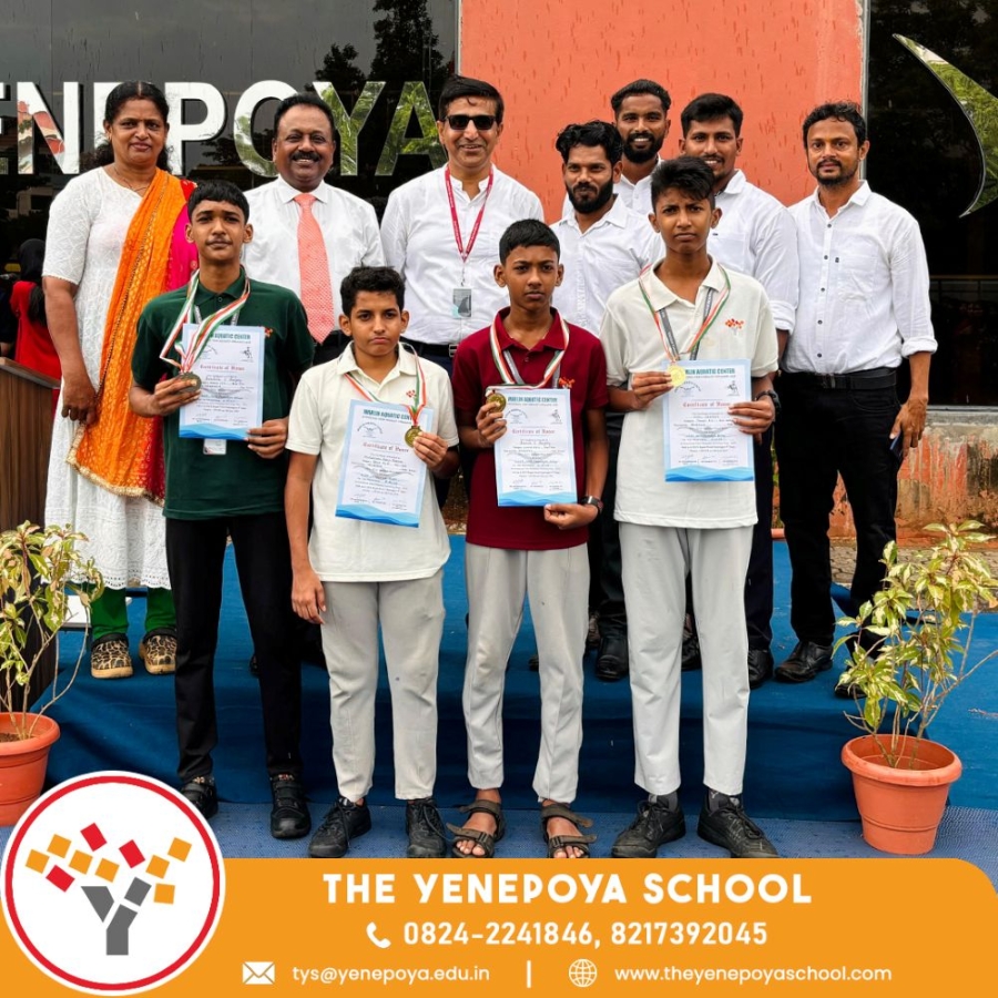 The swimming champions of The Yenepoya School brought laurels by winning 4 gold and 1 bronze medal in the State level Swimming Meet 2024, organized by Marlin Aquatic Centre in Mysore. These students were also honored by the dignitaries.