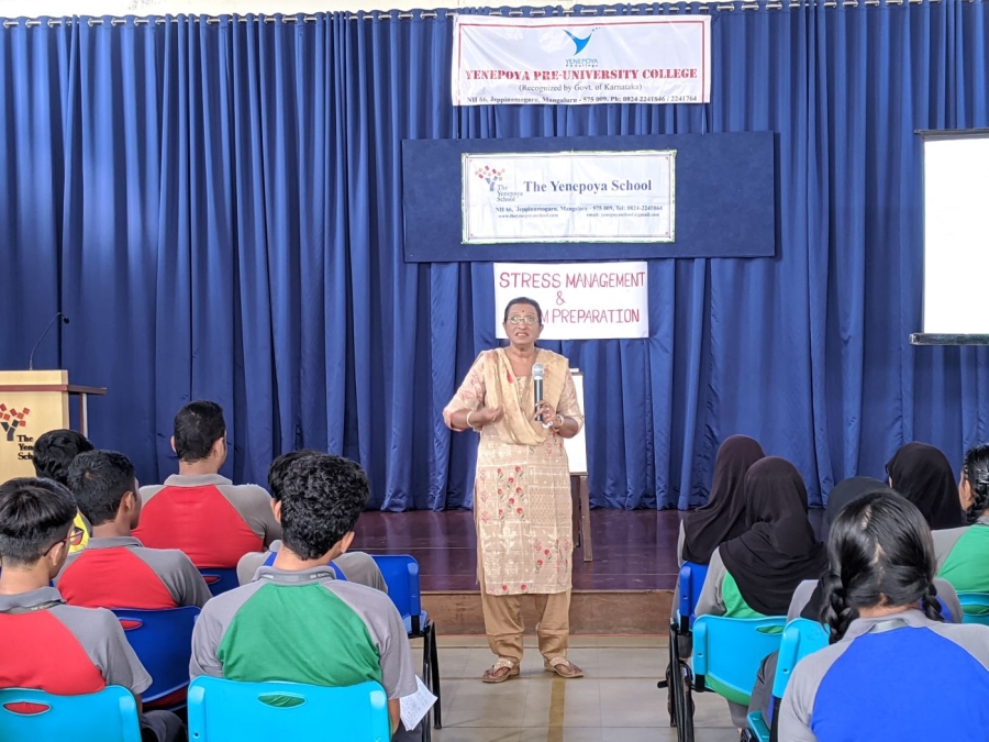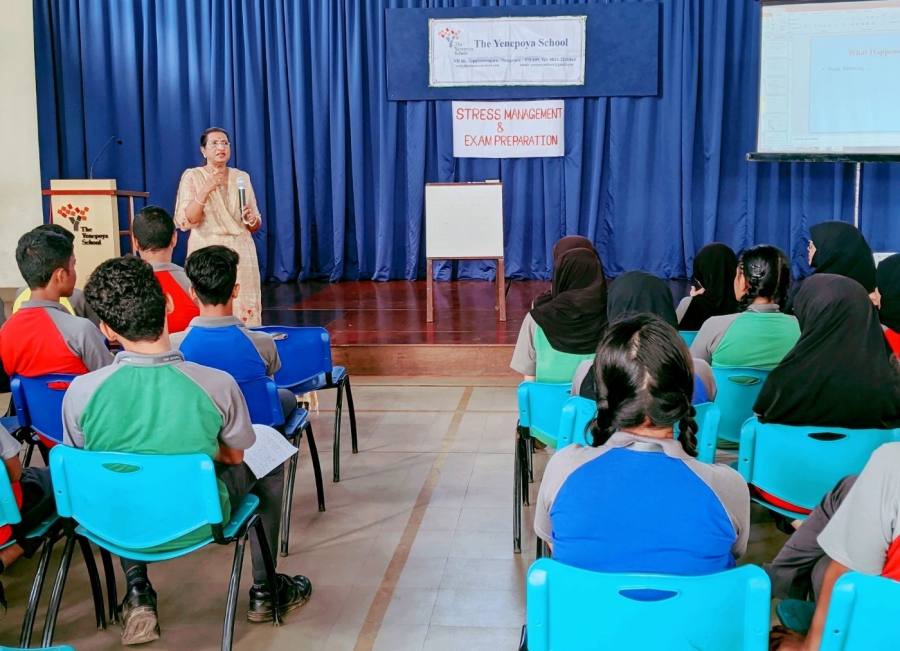 The students of Grade 9 & 10 were given a talk on 'Stress Management & Exam Preparation' by Dr. Rameela Shekhar on the 17th of January, 2020 at The Yenepoya School Auditorium. The talk was very interactive, it stressed on matters like managing exams, study schedule, importance of concentration & relaxation.
