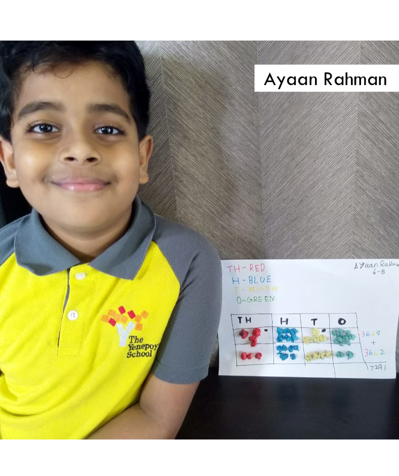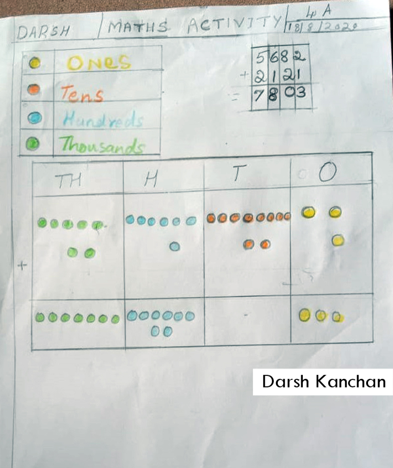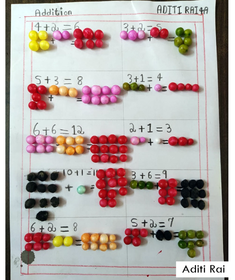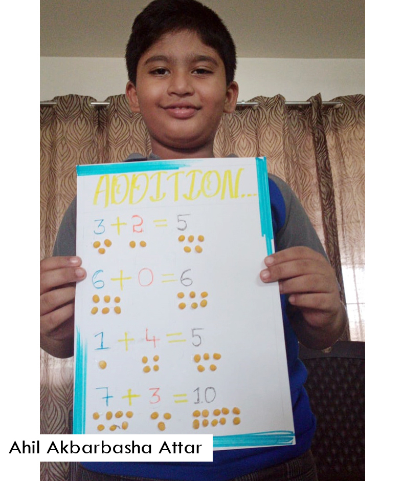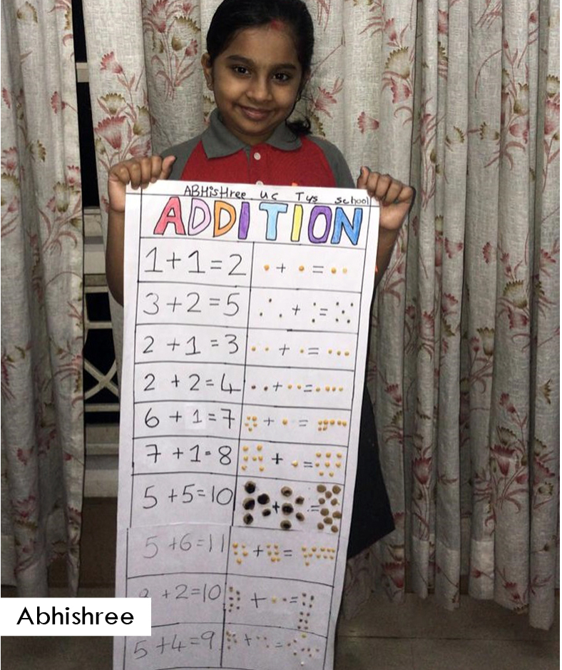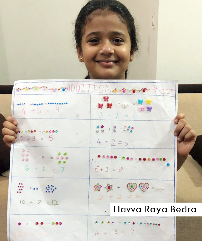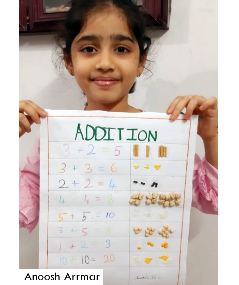As a part of Math curriculum, students of Grade 4 were asked to prepare addition chart with the help of colourful pencils, grains or beads. Students took part actively, showing some amazing creativity. Kudos to their participating spirit.